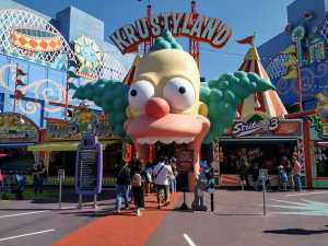 Seguidamente fuimos a Springfield. Aquí encontramos una atracción de realidad virtual. También podéis comeros una Krusty Burguer, tomaros una cerveza en el bar de Moe, comeros una rosquilla…Saldréis rodando, os lo aseguramos.