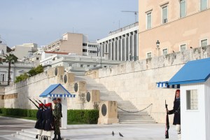 Nos situamos frente la Plaza Sintagma al lado del parlamento, para encontrar la tumba del soldado desconocido. Consiste en un monumento vigilado siempre por los Evzones, guardias griegos. Este monumento conmemora a los soldados que murieron defendiendo la patria en las guerras del pasado.